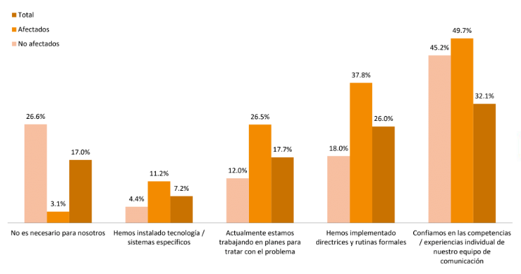Para identificar a las fake news, el 26,0% de las organizaciones implementa directivas y rutinas formales, y tienen un porcentaje mayor de implementación de acciones en este sentido (37,8%). Sin embargo, apenas el 7,2% de las organizaciones afirma haber instalado tecnologías y sistemas específicos. Esto suscita dudas sobre los métodos y los procesos utilizados por los profesionales de comunicación para realizar la identificación de falsedades. También sorprende que a pesar de la preocupación general, el 17% de las organizaciones todavía cree que no es necesario estar preparadas para identificar potenciales noticias falsas. Es claro que ese porcentaje de irrelevancia mostrado ante la problemática es bajo (26%), sobre todo para empresas que no sufrieron ningún tipo de interferencia generado por las fake news.
