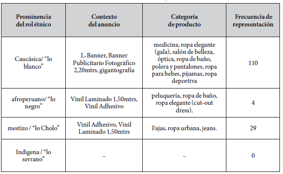 Como se observa en la Tabla 1, del total de imágenes analizadas (n=73), 59 representan el componente humano a través de la construcción de un rostro caucásico, especialmente en materiales publicitarios de gran formato, como banners de 1.5 a 2 metros y gigantografías. En contraste, los rostros de personas negras o mestizas (“cholos”) aparecen únicamente en viniles de formato medio, de hasta 1,5 metros. Esta distribución sugiere que la representación de lo caucásico se asocia con la vitrina y el pórtico del consumo, mientras que las figuras negras o mestizas se utilizan para reforzar estímulos de compra en movimiento, con una visibilidad más concentrada y menos panorámica. A pesar de que la categoría “lo serrano” ha sido identificada como una forma de referirse a lo indígena en Gamarra, según la investigación de Cuevas-Calderón y Villafuerte (2022), no se encuentra presente en las imágenes publicitarias analizadas, evidenciando así la exclusión de lo indígena en la representación comercial.