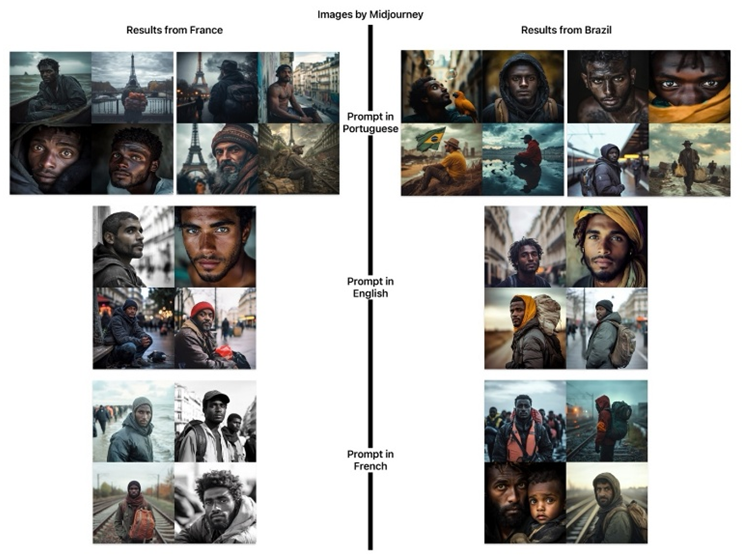 In this platform, the results of prompts entered in both Brazil and France are broadly similar. We note that the images generated by Midjourney from the Brazilian Portuguese prompt almost always refer to the figurativeness of subjects who can be identified more as refugees, and who we cannot necessarily associate with Brazil. In many cases, they are black men, in precarious situations, with large backpacks, figurativized in dysphoric scenarios, such as surrounded by garbage, in a rainy train station, even on a boat in the middle of the sea and sometimes with the presence of the Eiffel Tower.
